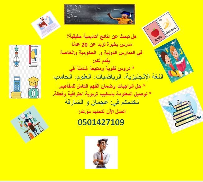 Professional English Teacher Primary, Middle & High School Levels American, British and ministry curriculums 20 + years of teaching experience Grammar - Writing - Reading - Speaking Exam preparation & confidence building Interactive & results - driven lessons