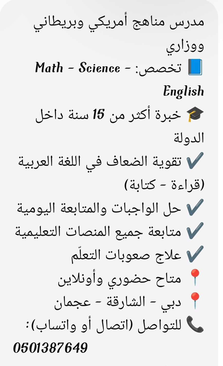 Teacher for American, British, and Ministry Curricula Specializations Math - Science - English Over 15 years of experience within the UAE Strengthening weak students in Arabic (reading & writing) Homework assistance and daily follow - up Monitoring and support for all educational platforms Learning difficulties intervention Contact (Call