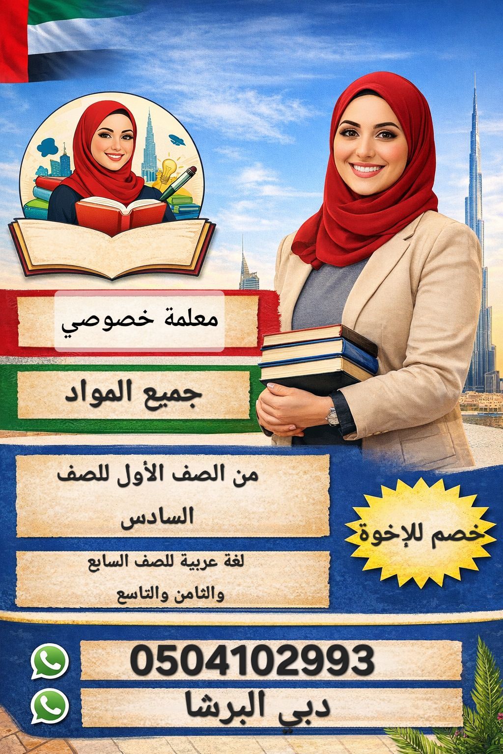 Egyptian teacher with a Master’s degree and 12 years of experience. Teaches all subjects for students from Grade 1 to Grade 6, and Arabic language for Grades 7 to 9. Provides homework help, platform support, and weekly study plan follow - up. Sibling discount available. Located in Barsha and nearby areas in Dubai
