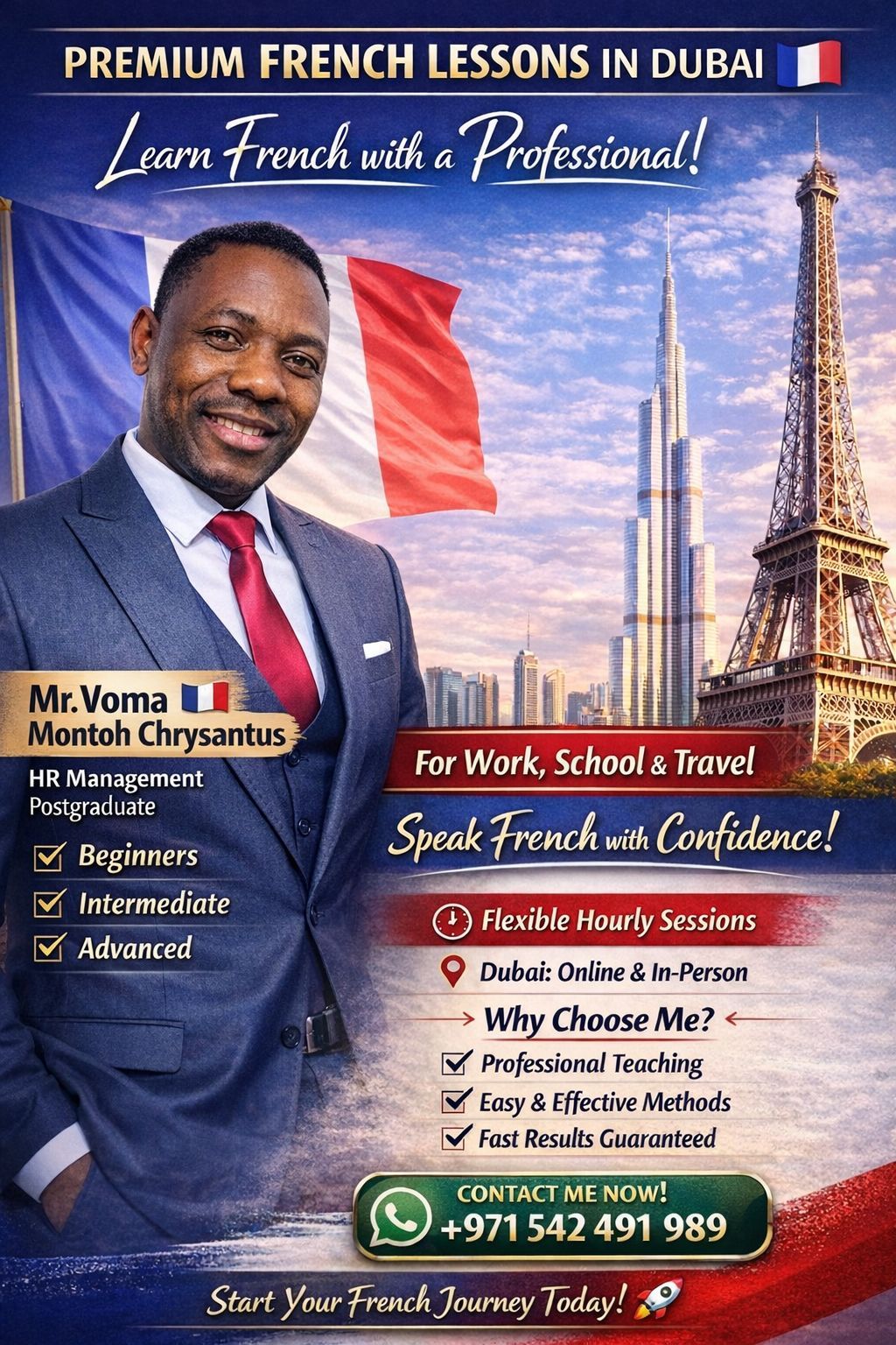 PREMIUM French LESSONS IN Dubai Learn French with a Professional I am Mr. Voma Montoh Chrysantus, a highly qualified Cameroonian professional based in Dubai, holding a Postgraduate Degree in Human Resource Management. I offer high - quality, personalized French lessons designed for Beginners Intermediate learners Advanced speakers Whether for work, school, travel, or personal