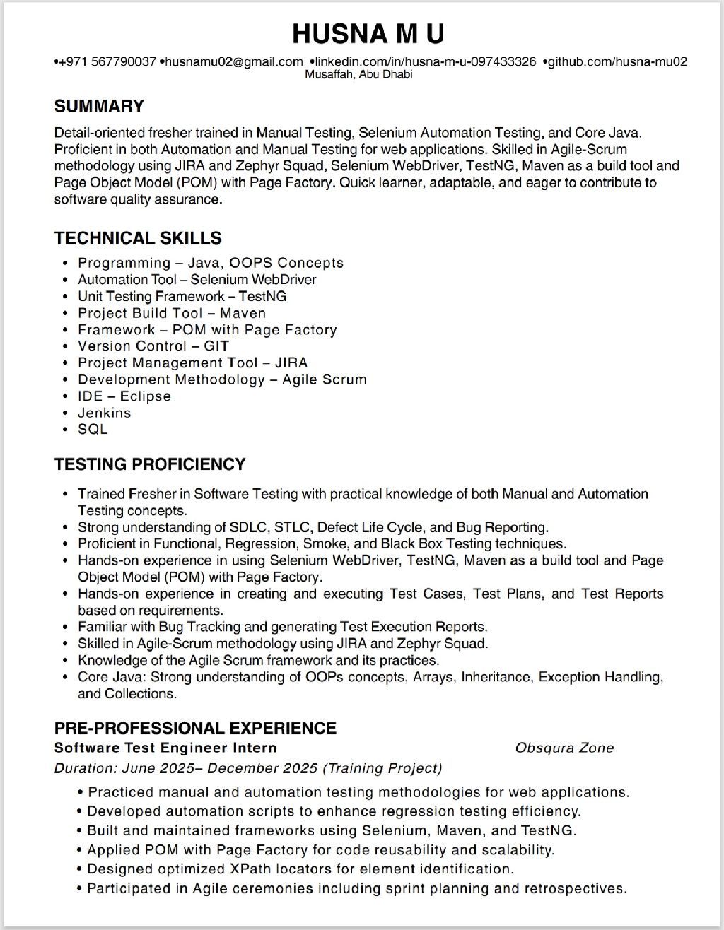 I am a Computer Science graduate (Fresher) and a trained QA Engineer with hands - on knowledge in both Manual and Automation testing. I have completed structured training covering test case design, defect tracking, SDLC/ STLC, and automation testing using Selenium. Although I am a fresher, I am job - ready and would not require additional training