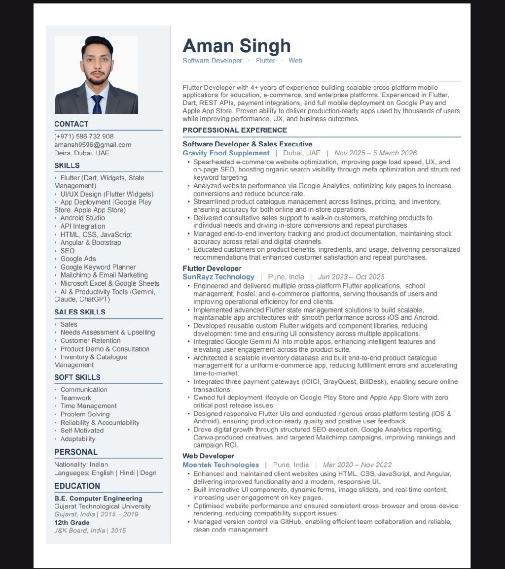 Professional software developer specializing in Flutter iOS/ Android apps with full experience publishing to the App Store and Google Play. Skilled in web development, building responsive websites using HTML, CSS, JavaScript, and Angular. Strong background in UI/ UX design, focused on creating intuitive, high - quality user experiences. NO PAID Jobs Please)