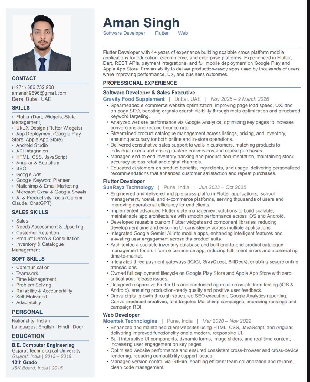 Software Developer with over 4 years of experience seeking opportunities in Flutter or web development. Skilled in UI development, API integration, and building scalable applications. Detail - oriented, adaptable, and quick to learn new technologies. Open to growth - oriented roles and available immediately. Seeking direct opportunities only (No Paid Offers Please)