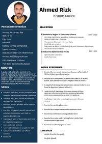 أنا أحمد رزق، 30 سنة، مصري ومقيم في الامارات زيارة. لدي خبرة في التخليص الجمركي، المبيعات، خدمة العملاء، والكاشير، وعملت في شركات تخليص جمركي في الامارات (جبل علي) وفي مصر. حاصل على بكالوريوس حاسب آلي، وأتقن الكمبيوتر والأوفيس، أتحدث العربية بطلاقة والانجليزية بمستوى مقبول، ملتزم وقادر على التعلم السريع، وجاهز للعمل في أي وظيفة وبأي امارة