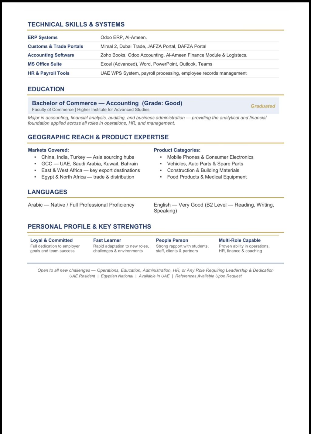 Operations Manager Logistics Human Resources Accountant Sports Coach A seasoned professional with over 7 years of experience in operations management within the UAE (DAFZA & JAFZA) starting from sales and progressing to Operations Manager and Human Resources. I also possess training skills as a trainer and experience working with schools and students