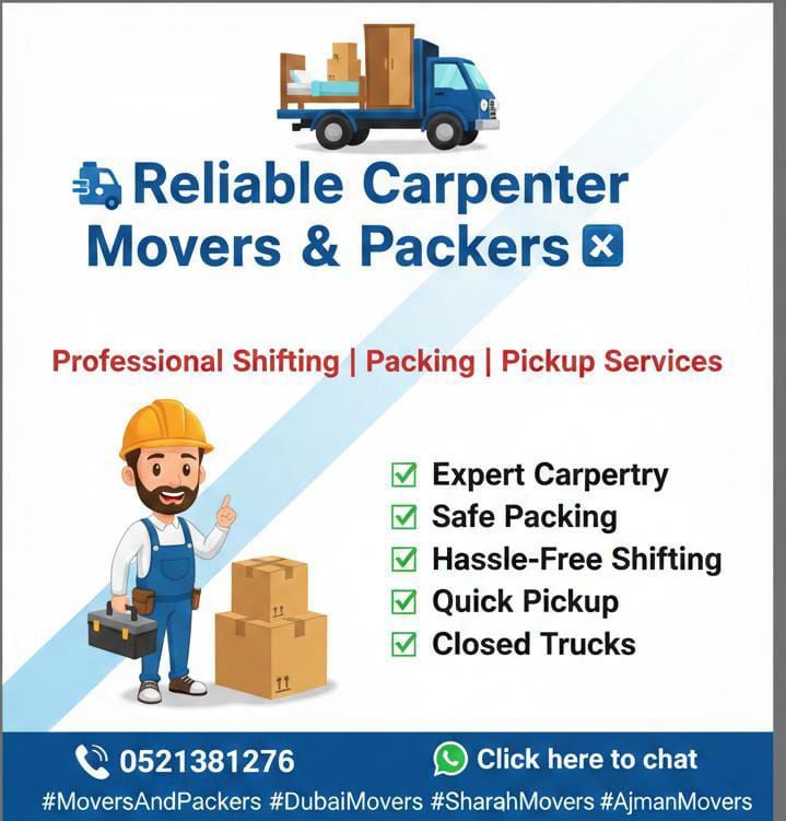 Carpenter movers and Packers & Experts Carpenters. Cargo Packing. Boxe and Packing Material Supplies. Small & Big Trucks avialible 24 Hours Moving shifting service call me Or WhatsApp Any Time All UAE. Thank you for Contact