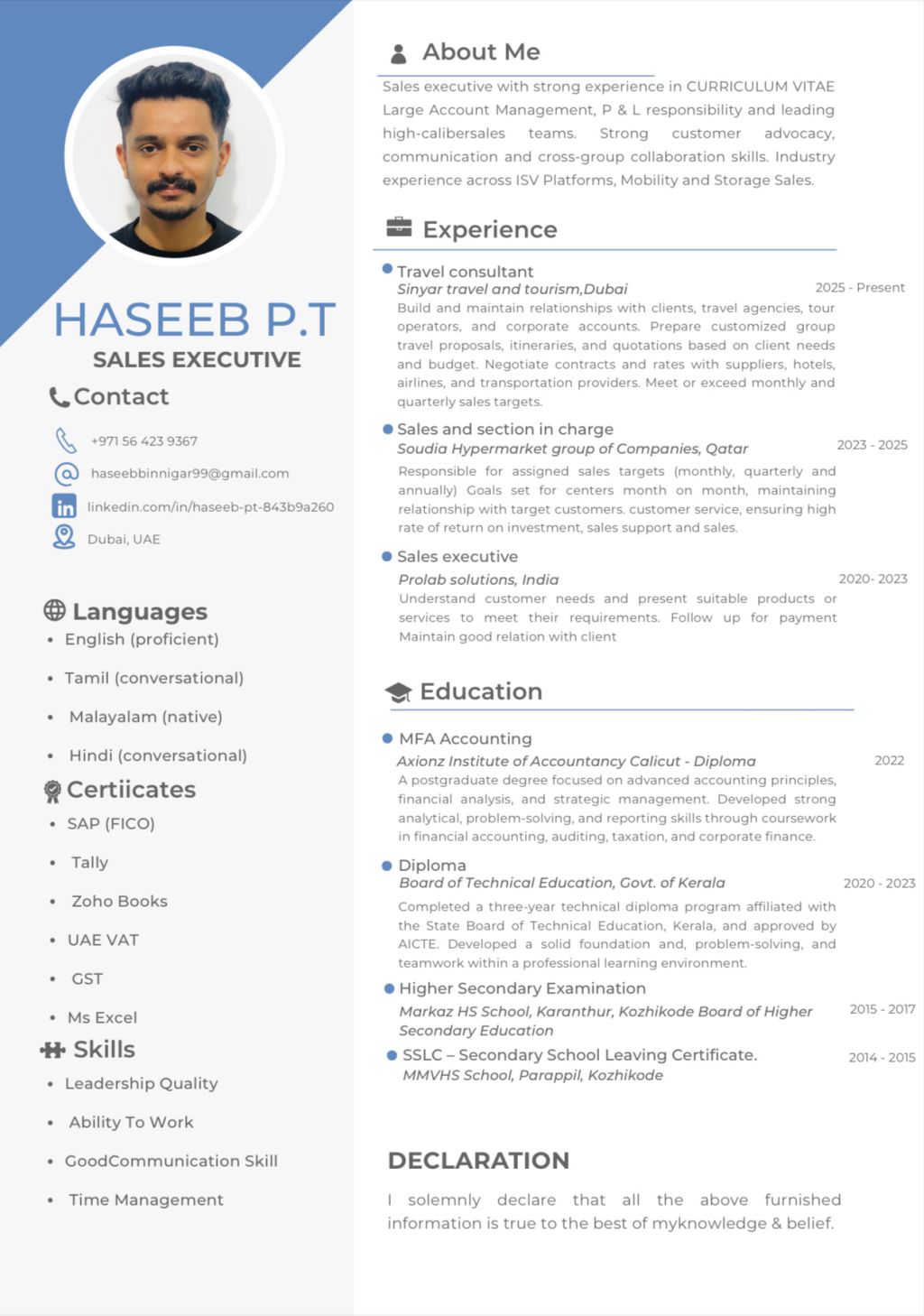 Im an experienced Sales Executive with over 4 years experience in sales field. Currently I am working as a sales executive in sinyar travel and tourism Dubai. Recently 2 years I am working as a Section In - Charge at Soudia Hypermarket Group of Companies, Qatar. Skilled in client relations, team coordination, payment follow - ups. Fluent in English, Hindi, Tamil and Malayalam