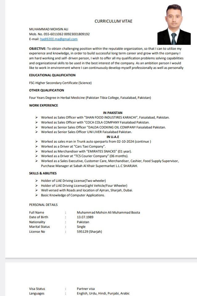 My name Muhammad Mohsin Ali, I am from Pakistan living in Sharjah. My visa status own my visa but partner visa. I have experience in UAE 11 years sales marketing indoor and outdoor. I have experience supermarket supervisor. sales executive. customer care. marchendisr. I hope you see my CV and give me good opportunities. I am so hard working. Thanks & Regards Muhammad Mohsin Ali