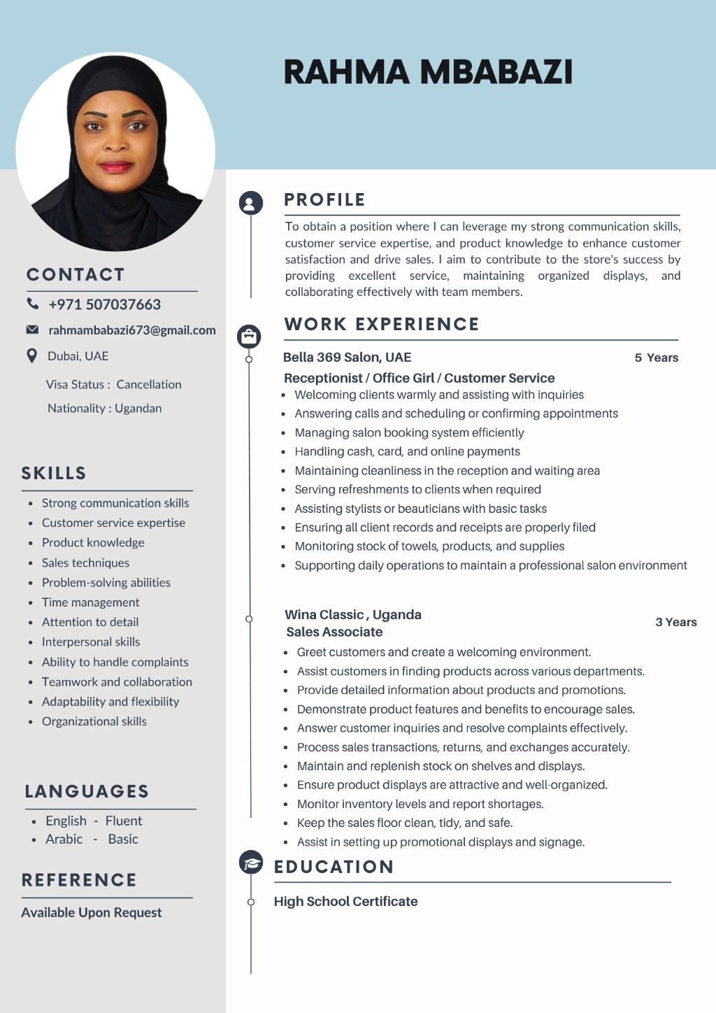 I am a lady looking for a job as a Sales Associate, Customer Service Representative, or Receptionist in the UAE. My name is Rahma, motivated and customer - focused professional with over 5 years of experience in customer service, sales, and front - desk operations. I have worked in dynamic environments such as Bella 369 salon (UAE) and Wina Classic (Uganda) where I developed strong communication, organizational