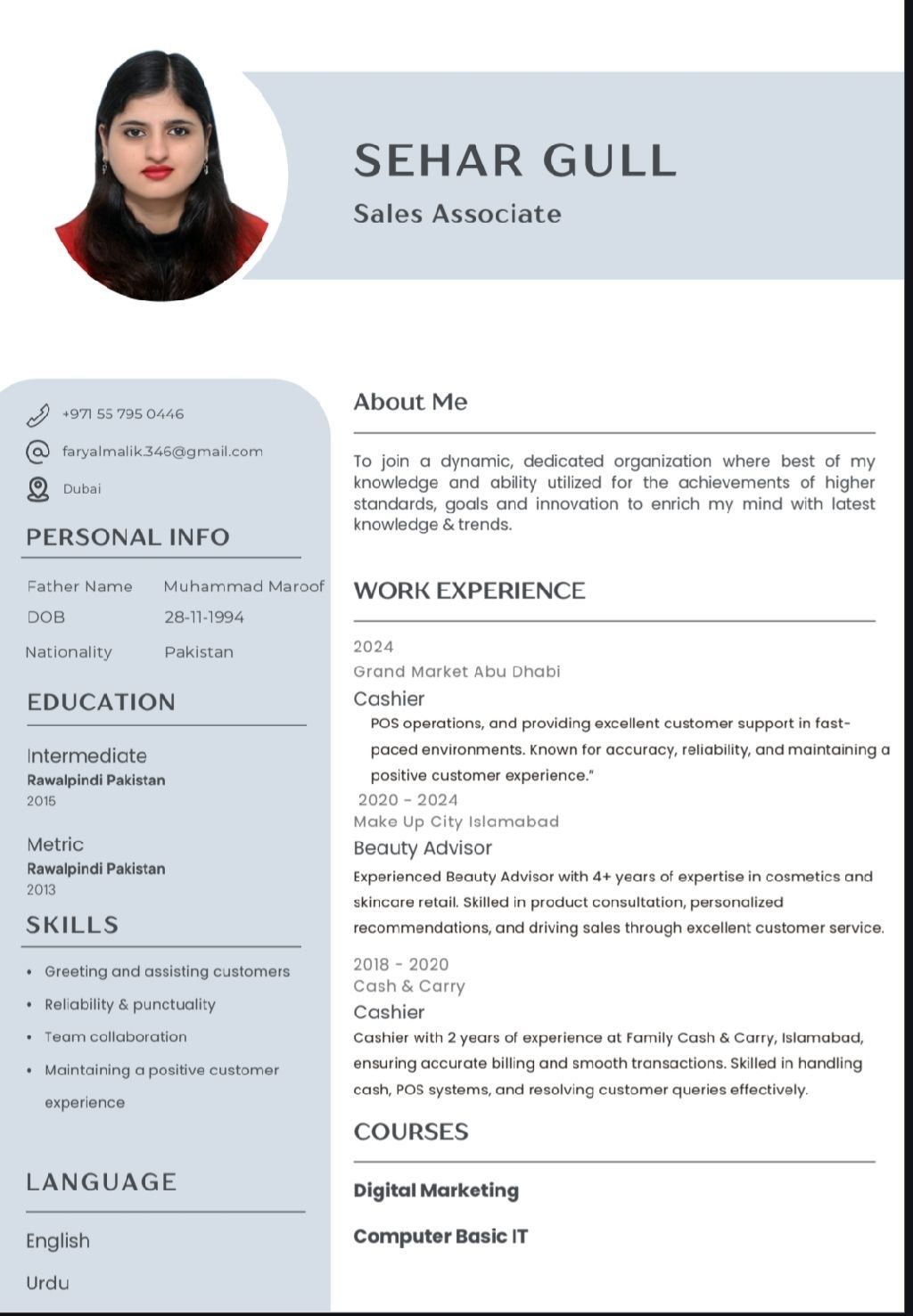 Sales Girl/ Cashier/ Receptionist Ready to Join Immediately in UAE. Energetic and customer - focused Sales Associate with 5 + years of experience in cashiering and customer service. Skilled in POS systems, billing, and maintaining excellent customer satisfaction. Currently in Abu Dhabi and ready to join immediately