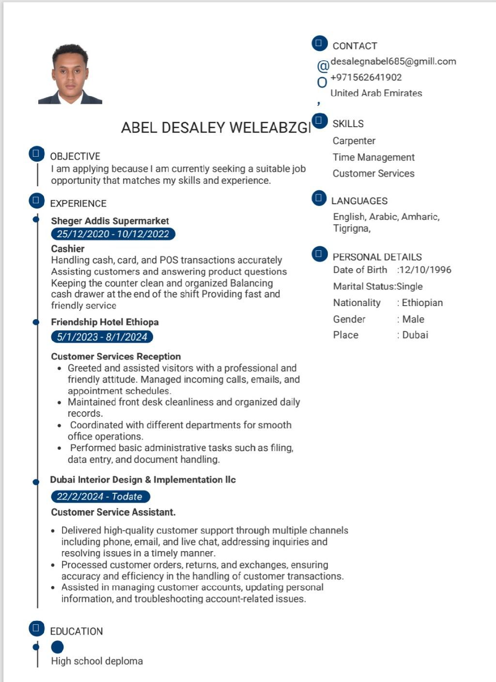 My name is Abel. I live in Dubai. I have worked in Dubai for two years. I speak English and Arabic. If you have any job vacancies, we can work together