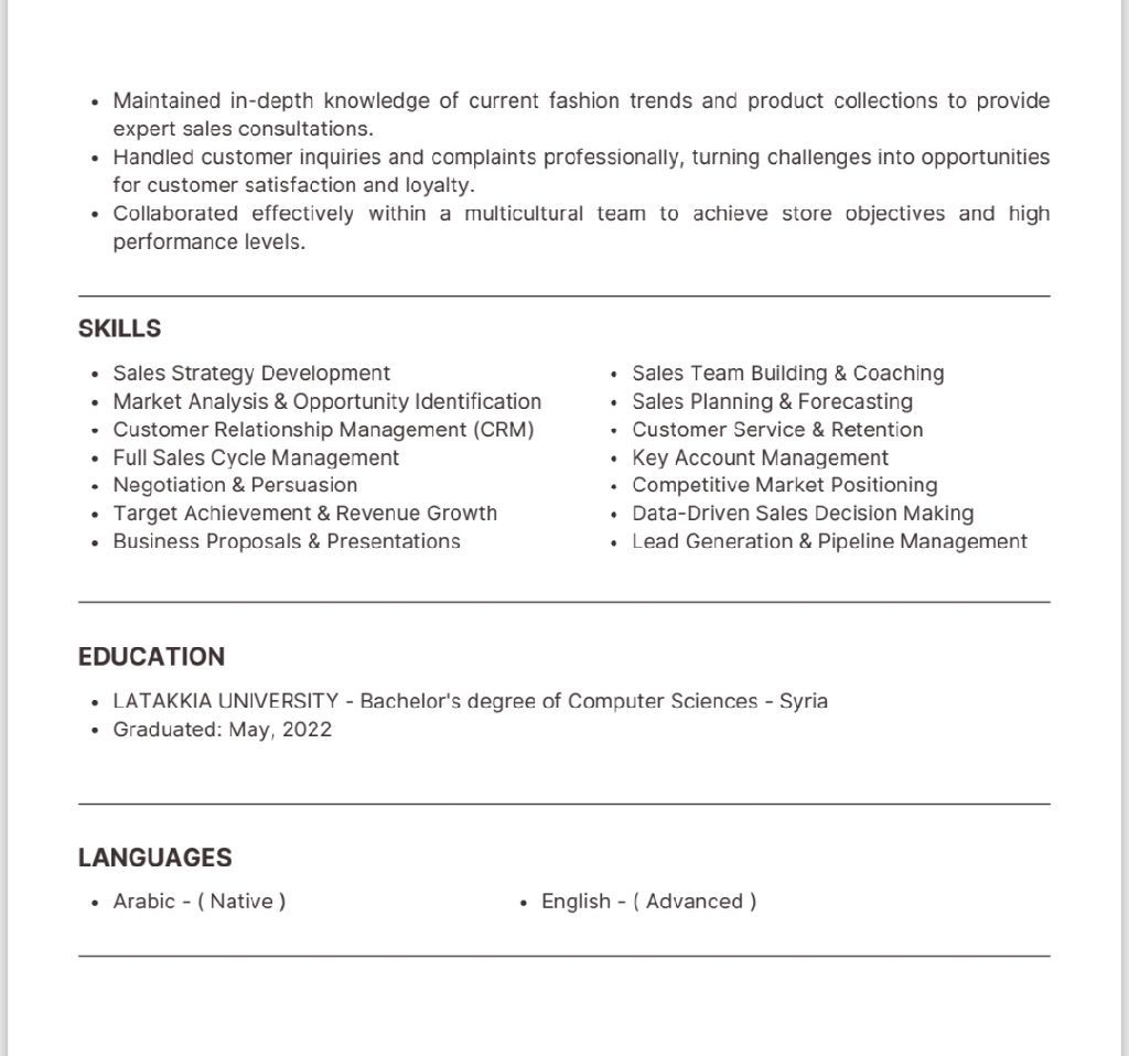 Highly accomplished Luxury Sales Associate with over 4 years of experience in premium retail, specializing in apparel sales within the Dubai luxury market. Renowned for delivering an elevated client experience through personalized service, deep product knowledge, and refined selling techniques. Proven ability to exceed sales targets, build long - term relationships with high - value clients, and u