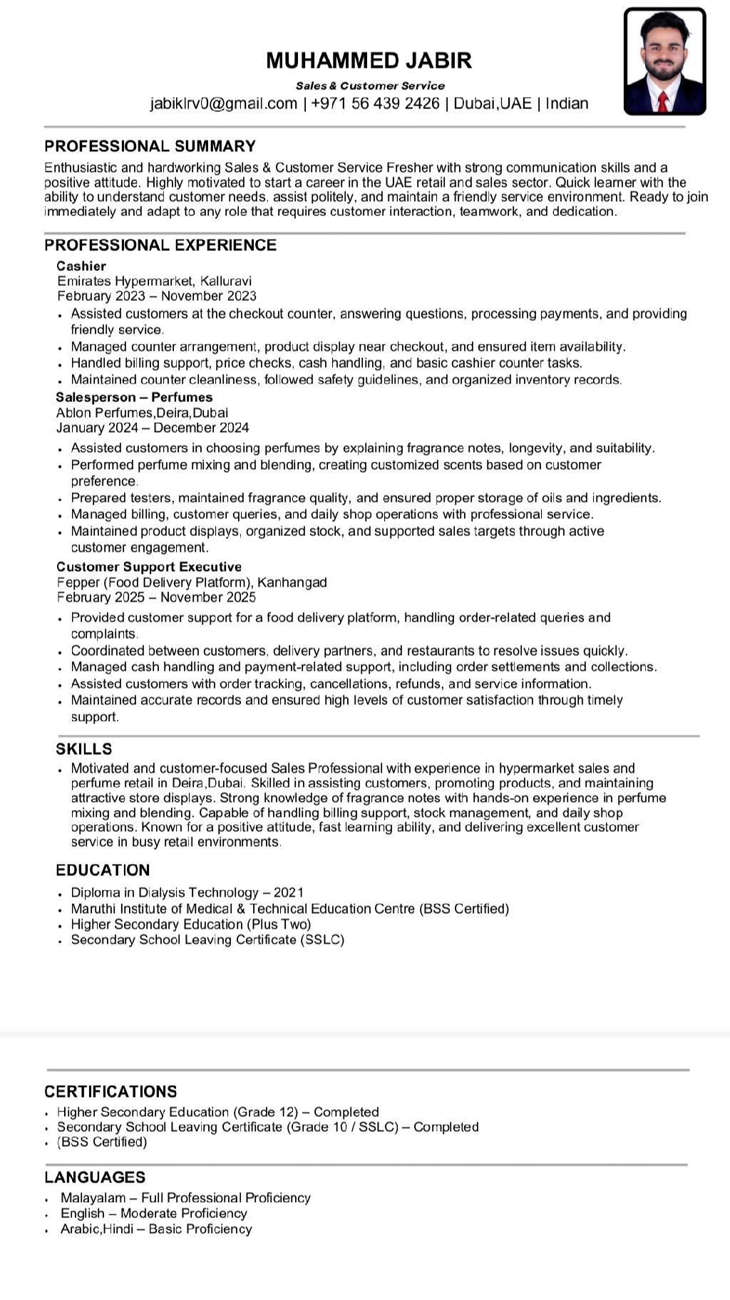 Enthusiastic and hardworking Sales & Customer Service Fresher with strong communication skills and a positive attitude. Highly motivated to start a career in the UAE retail and sales sector. Quick learner with the ability to understand customer needs, assist politely, and maintain a friendly service environment. Ready to join immediately and adapt to any role that requires customer interaction