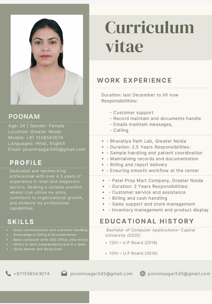My name poonam, I am from india. now am living Sharjah, and my visa status visit visa. I have sales experience. customer support. record maintain and documrnts handle. emails maintain messages calling
