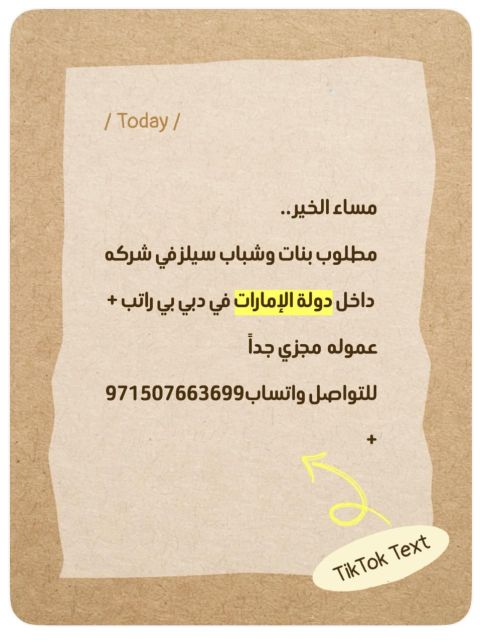 مطلوب مسوقة عطور من مكتب الشركة في دبي ديرة شارع السبخة تدير حملات اعلانية على مواقع التواصل بالاضافة الى عمل بثوث عبر التيك توك وبعض مواقع التواصل براتب + عمولة