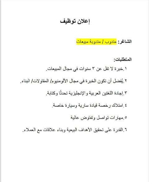 فرص عمل مطلوب مبيعات وتسويق