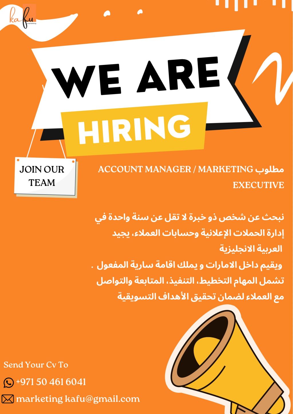 HIRING ACCOUNT نحن في شركة KAFU في دبي - البزنس باي نبحث عن Marketing Executive ذو خبرة لا تقل عن سنة في إدارة الحملات الاعلانية وحسابات العملاء، يجيد العربية والانجليزية. المهام تشمل التخطيط، التنفيذ، متابعة الحملات، والتواصل مع العملاء لضمان تحقيق الأهداف التسويقية
