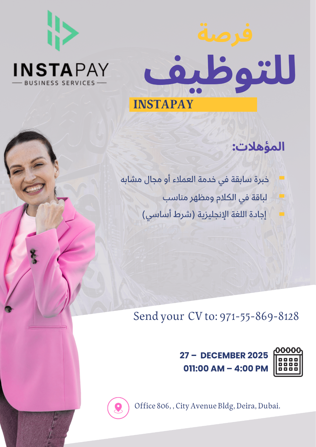 فرصتك لتكون جزء من تيم (InstaPay) المطلوب خبرة سابقة في مجال المبيعات (يفضل في قطاع الخدمات الحكومية) لباقة في الكلام ومظهر مناسب. مهارات تواصل واقناع ممتازة باللغتين العربية والانجليزية. القدرة على التعامل مع مختلف الجنسيات. لو شايف انك الشخص المناسب تواصل معنا / العنوان Office 806، City Avenue Bldg, Deira, Dubai. اللوكيشن واتساب ايميل