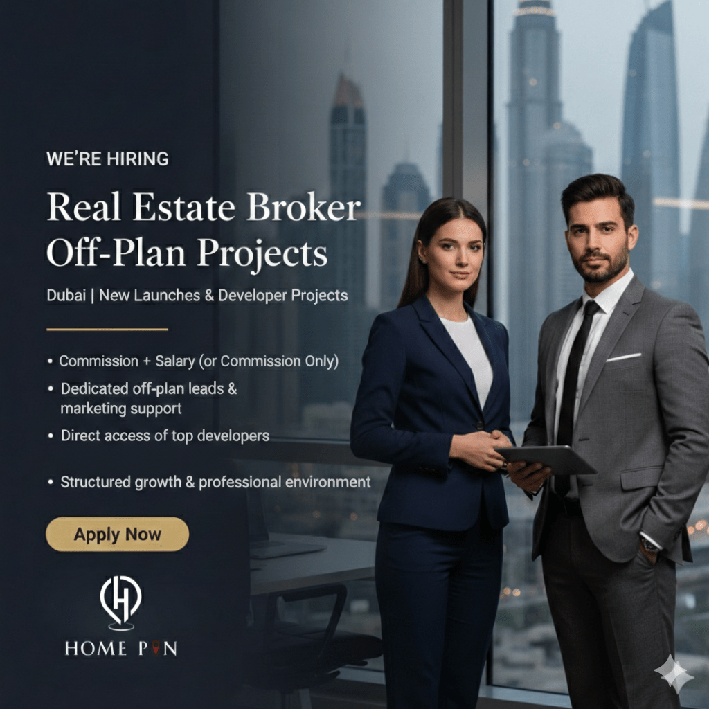 نبحث عن وسيط عقاري محترف لديه خبرة في مشاريع Off - Plan للانضمام الى فريق Home Pin real estate والعمل مباشرة على أقوى اطلاقات المطورين في دبي والشارقة. ماذا نقدم لك - عمولة مجزية + راتب (أو عمولة فقط حسب الخبرة) ليدز حصرية لمشاريع Off - Plan - دعم تسويقي كامل من فريق متخصص - وصول مباشر لأفضل المطورين - بيئة عمل منظمة وخطة نمو واضحة المتطلبات خبرة لا تقل عن سنة في المبيعات العقارية في دبي - معرفة بمشاريع