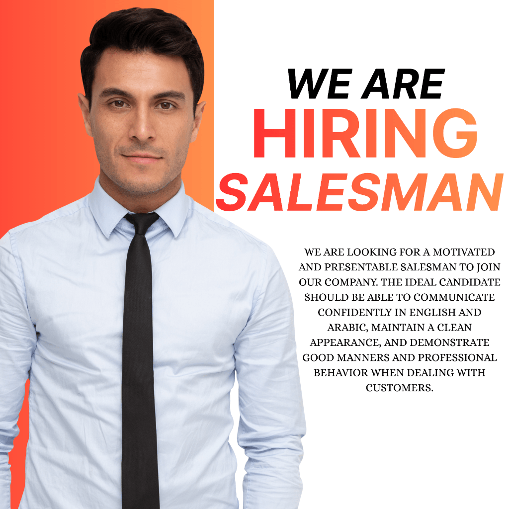 نعلن عن وظيفة شاغرة - مندوب مبيعات في الخبيصي يتمتع بالحماس والمظهر اللائق للانضمام الى شركتنا. يشترط اتقان اللغتين العربية والانجليزية، والالتزام بالمظهر النظيف، والتحلي باللباقة وحسن التعامل مع العملاء. الخبرة غير مطلوبة، حيث سيتم توفير تدريب كامل للمرشحين المناسبين. هذه الوظيفة مناسبة لمن لديه الرغبة في التعلم وبناء مستقبل مهني في مجال المبيعات. نوفر بيئة عمل داعمة وفرص تطوير ونمو وظيفي