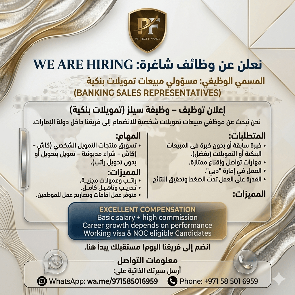 اعلان توظيف - وظيفة سيلز (تمويلات بنكية) إمارة دبي نحن نبحث عن موظفي مبيعات تمويلات شخصية للانضمام الى فريقنا داخل دولة الامارات. المهام تسويق منتجات التمويل الشخصي المتطلبات خبرة سابقة أو بدون خبرة في المبيعات البنكية أو التمويلات (يفضل) مهارات واقناع ممتازة. القدرة على العمل تحت الضغط وتحقيق النتائج عمولات مجزية تدريب وتأهيل كامل. أرسل سيرتك الذاتية على الرقم المسجل لتحديد موعد الانترفيو