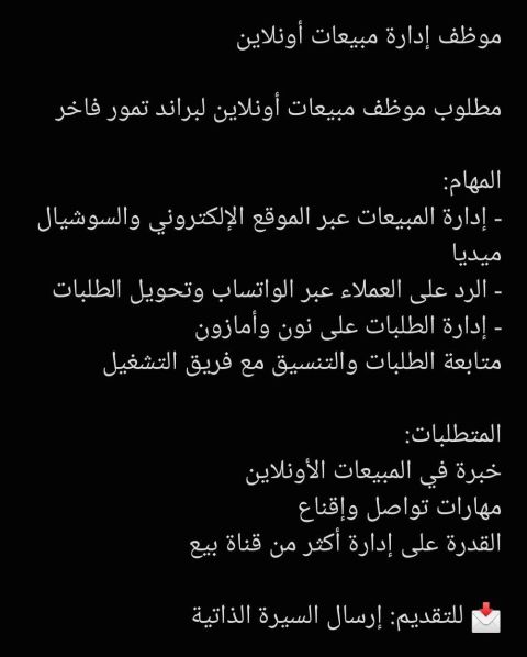 مطلوب موظف ادارة مبيعات الأون لاين - خبرة في المبيعات الاونلاين - مهارات تواصل واقناع - القدرة على إدارة أكثر من قناة بيع - يجيد اللغة العربية والانجليزية بطلاقة