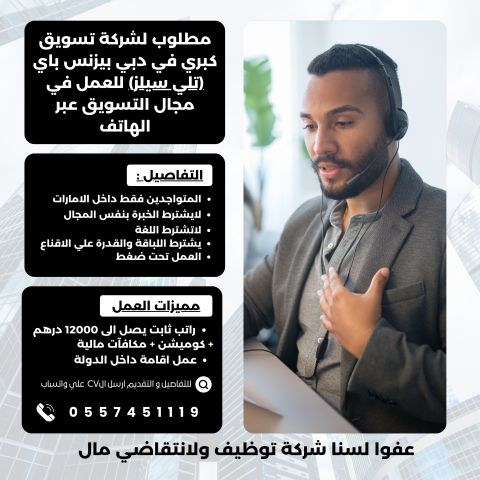مطلوب لشركة تسويق كبرى في دبي الخليج التجاري - تيلي سيلز للعمل في مجال التسويق عبر الهاتف (المتواجدين فقط داخل الامارات - يرجى عدم التواصل من خارج الامارات - لا يشترط الخبرة بنفس المجال ولا تشترط اللغة يشترط اللباقة والقدرة على الاقناع والعمل تحت ضغط. مميزات العمل (راتب ثابت وكوميشن ومكافآت مالية وعمل إقامة داخل الدولة) للتواصل والتقديم يرجى ارسال CV على واتساب. عفوآ لسنا شركة توظيف ولا نتقاضى أجرا