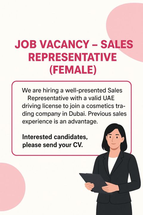 تسعى شركة تجارة مستحضرات التجميل الراسخة في دبي (منطقة الممر) الى الحصول على مندوب مبيعات محترف ومقدم جيدا مع رخصة قيادة سارية المفعول في الامارات العربية المتحدة. الخبرة السابقة في المبيعات هي ميزة اضافية. المرشحون المهتمون مدعوون لتقديم سيرتهم الذاتية