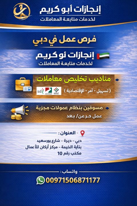 فرصة عمل للشباب والبنات في إمارة دبي ديرة بشركة انجازات أبو كريم لخدمات متابعة المعاملات مطلوب مسوقين بنظام العمولات المجزيه (عمل عن بعد) لجلب عملاء جدد لخدمات الشركة - مناديب تخليص معاملات محترفين في التعامل مع أنظمة تسهيل وآمر والاقتصادية - الموقع دبي ديرة شارع بور سعيد بناية الخيمة مركز اركان للأعمال مكتب رقم 10 - للتقديم والاستفسار يرجى مراسلتنا على الرقم