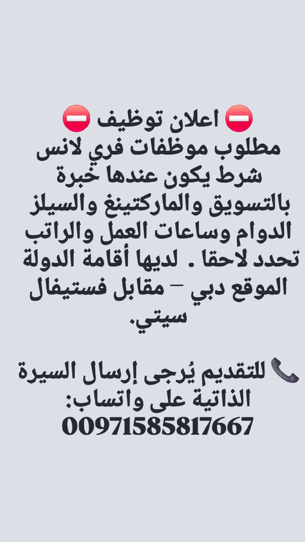 Employment Announcement FreeLance employees are required to have experience in marketing, and sales Work hours, and salary are determined later. Below. She has statehood. Location Dubai - vs Festival City. C To apply please send your WhatsApp CV