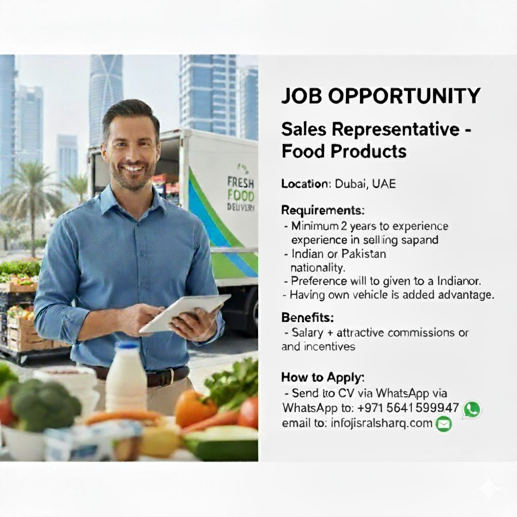 Sales Representative - Food Products. Requirements Minimum 2 years of experience in selling food products - Excellent communication and persuasion skills. Valid driving license. Having own vehicle is an added advantage. Benefits Salary + attractive commissions and incentives. Dubai - Al Garhoud
