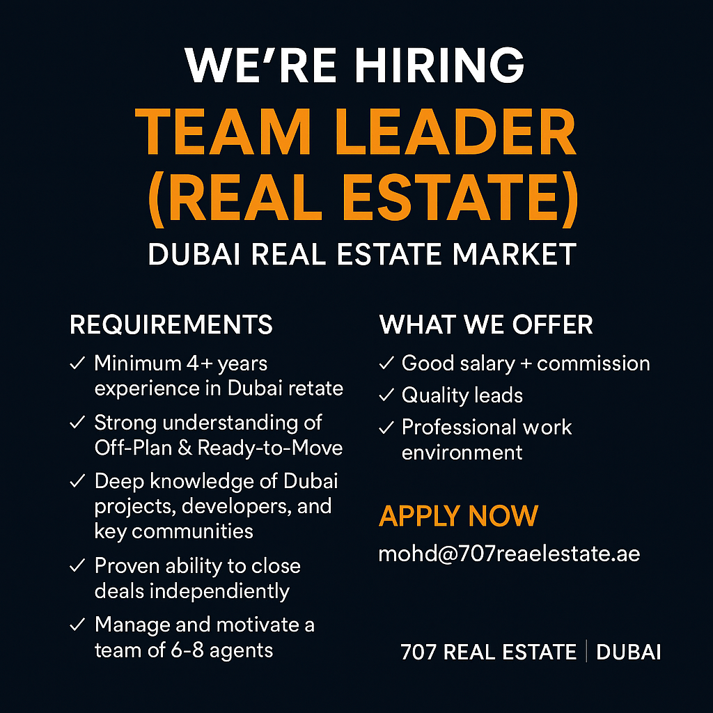 WE’ RE HIRING - TEAM LEADER (real estate) Dubai real estate Market 707 real estate is looking for an experienced real estate Team Leader with a minimum of 4 years of proven experience in the Dubai real estate market. This is a leadership role for someone who can close deals personally and lead a high - performing sales team. Requirements Minimum 4 + years experience in Dubai real estate Strong understanding