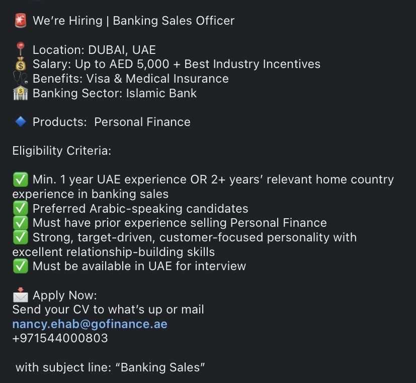 We're Hiring Banking Sales Officer Location Dubai, UAE Salary Up to AED5000 + Best Industry Incentives Benefits Visa & Medical Insurance iMi Banking Sector Islamic Bank Products Personal Finance