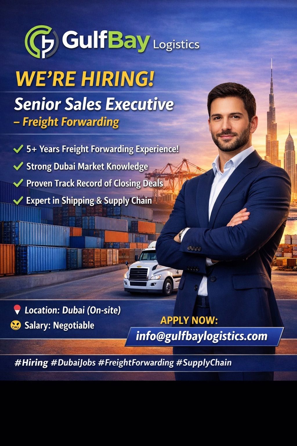 We’ re Hiring - Senior Sales Executive (Freight Forwarding) GulfBay Logistics is looking for a results - driven sales professional with minimum 5 years freight forwarding experience and strong Dubai Deira market knowledge. UAE driving license & own car required Dubai (On - site) Salary Negotiable