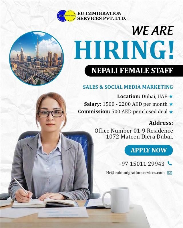 We Are urgently Hiring Nepali Female Staff For Our company job Position (Sales And social media Marketing) Salary 1500 - 2200 + each deals Commission 500, eligibility Age should be 25 - 35Y Must be able to work frequently, husband/ own visa Candidate Accept, Also Who dont visa can apply, Company will be Provide visa fro 2 years, for more info Dm
