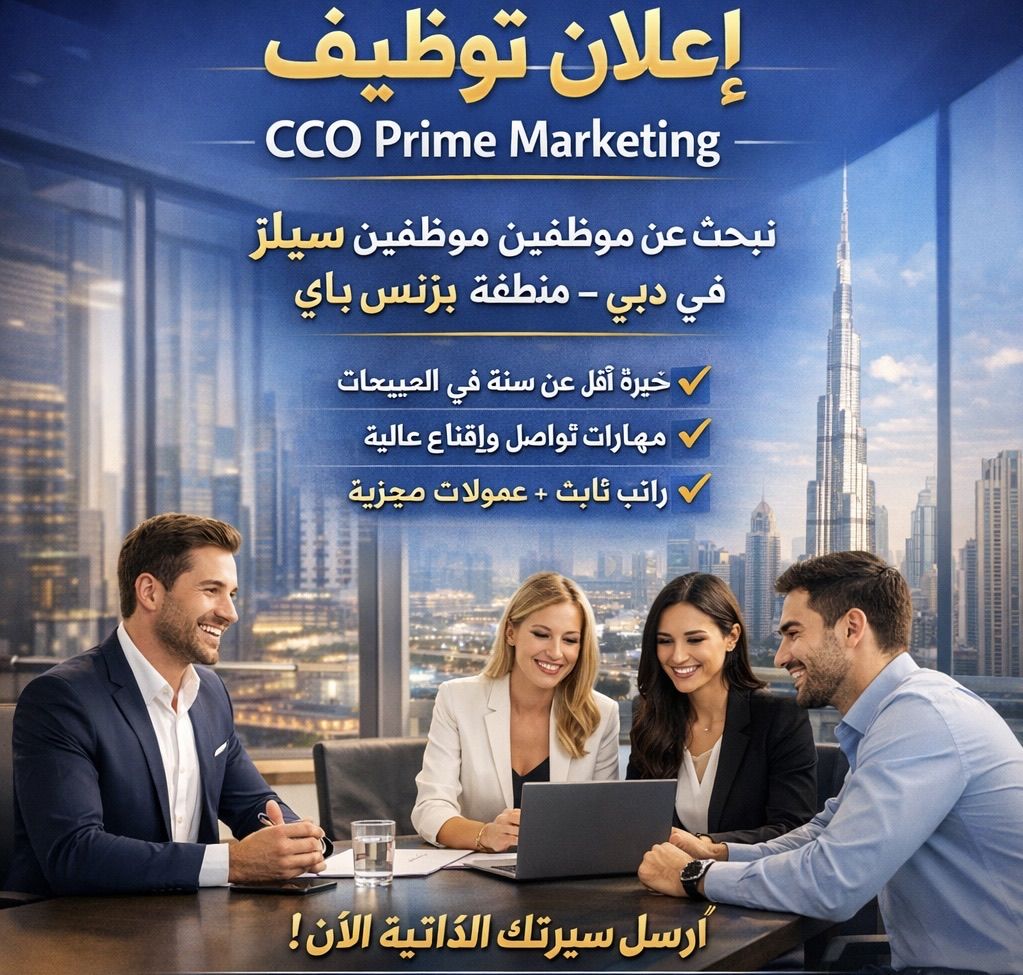 تعلن شركة CCO Prime Marketing، الوكيل الرسمي لشركة EC Market، عن حاجتها الى موظفين سيلز للعمل في دبي - منطقة بزنس باي. يشترط خبرة لا تقل عن سنة في المبيعات، مع مهارات تواصل واقناع عالية. راتب ثابت + عمولات مجزية