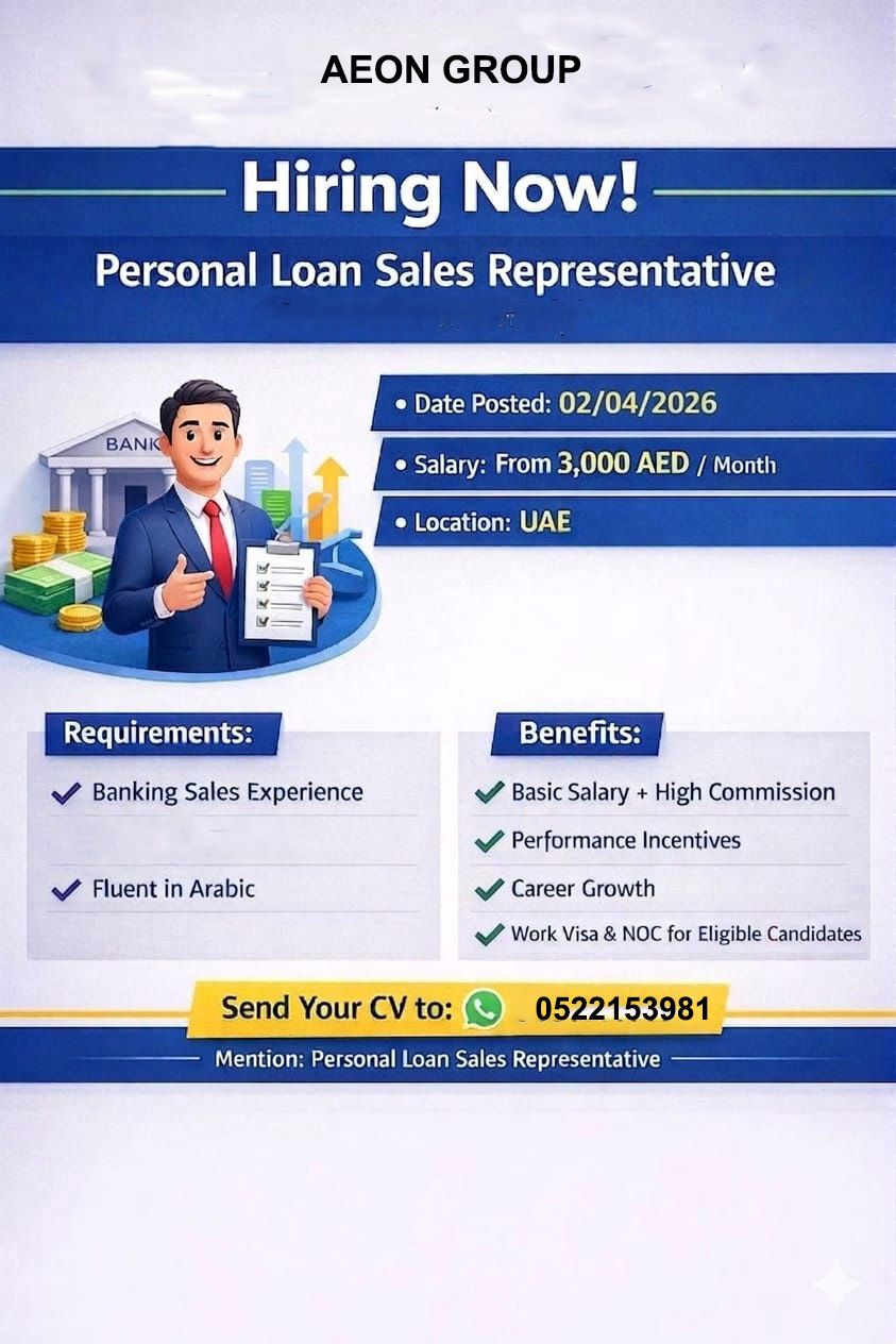 مطلوب موظفين خبرة وفريش لوظيفة سليز (بنك دبي الاسلامي) راتب ثابت وعمولات مجزيه إقامة تأمين صحي