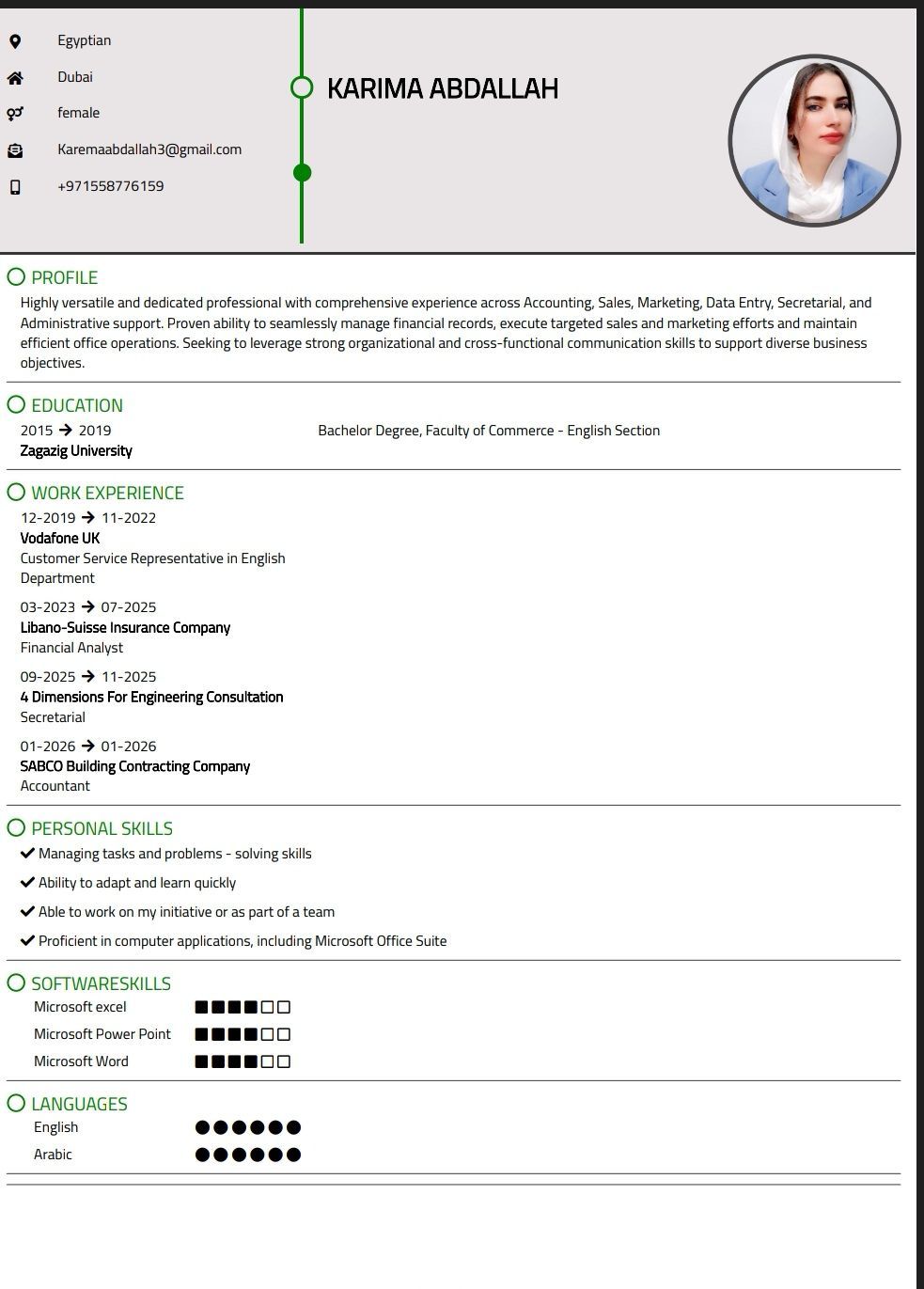 Highly motivated Egyptian resident in the UAE seeking employment Ready to contribute in Accounting, Marketing, Data Entry, Secretarial, Receptionist, or Customer Service. Fluent in both Arabic and English (Speaking & Listening) Eager to bring a dedicated, professional attitude to your team