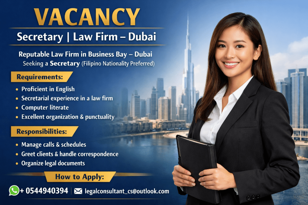 Vacancy - Secretary Law Firm - Dubai A reputable law firm in Business Bay - Dubai is seeking a Secretary (Filipina nationality preferred) Requirements Proficient in English Secretarial experience (preferably in a law firm) Computer literate Excellent organizational skills, punctuality, and professional client interaction Professional appearance Responsibilities Scheduling and managing calls Welcoming