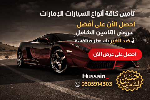 جميع أنواع التأمين في كافة أنحاء الامارات احصل الآن على أفضل عروض التأمين الشامل أو ضد الغير بأسعار منافسة يبدأ من 585 درهم لسيارات الصالون - 770 درهم فقط "تأمين شامل لسيارتك، حماية وأمان بلا حدود - أحدث العروض لتأمين سيارتك - شامل أو ضد الغير - راحة البال على الطريق مع أفضل خدمات التأمين - تغطية كاملة لسيارتك مع أسعار منافسة وخدمة سريعة - سيارتك بأمان، أينما كنت - تأمين شامل وخدمة 24 / 7