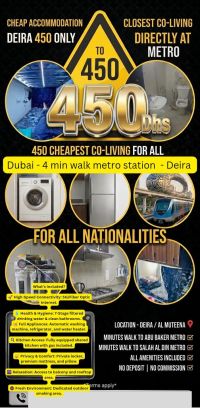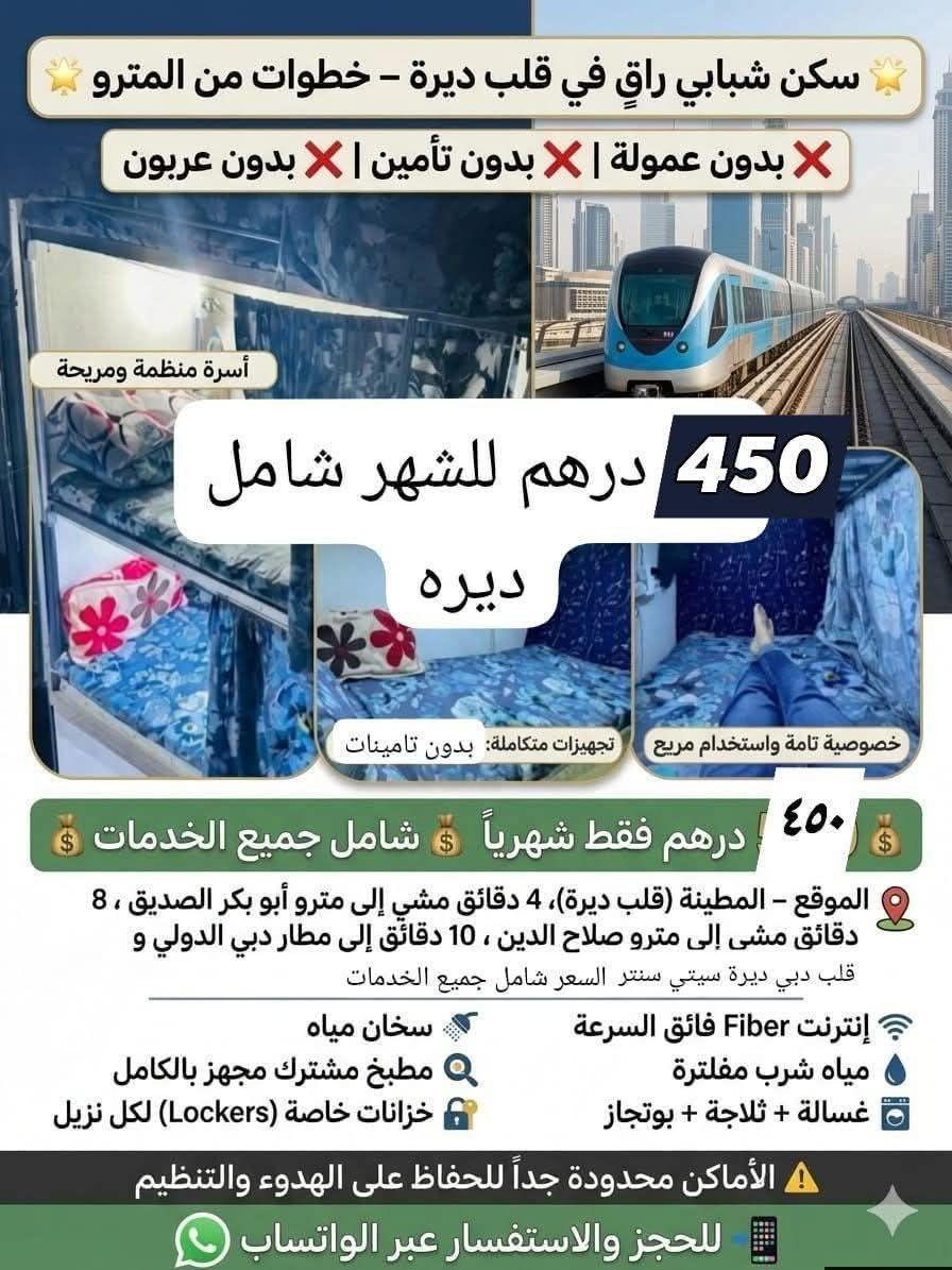 Youth Accommodation for Doctors and Those Who Abide by the Rules and Regulations. Only AED450 All - Inclusive Added location in the heart of Deira 4, within walking distance of the Dubai Metro Station. No Commission No Deposit No Security Deposit Price includes everything AED450 Price includes 5G/ Fiber Internet 7 - Stage Filt