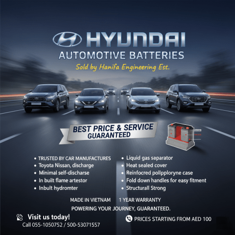 Power Up Your Ride Hyundai Automotive Batteries - Best Price Guaranteed Looking for a reliable, top - quality car battery Upgrade to Original Hyundai Automotive Batteriestrusted by major car manufacturers like Toyota, Nissan, Honda, Kia, and Hyundai MARKETPLACE Exclusive DEAL Prices start from just AED100 Best Price & Service Guaranteed by Hanifa Engineering Est. 1 - Year Warranty included for peace
