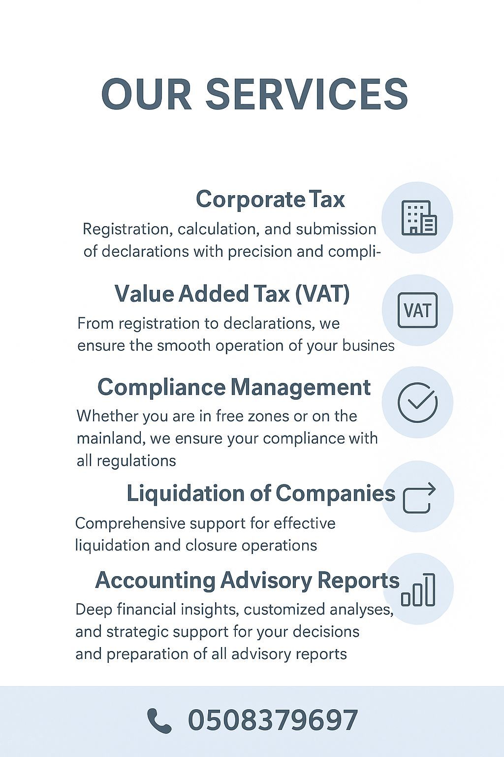 Our Services Corporate Tax Registration, calculation, and filing of returns with accuracy and compliance. Value Added Tax (VAT) From registration to returns, we ensure your business runs smoothly. Compliance Management Whether you are based in a Free Zone or on the mainland, we ensure your compliance with all regulations. Liquidation Integrated support for efficient liquidation and closure processes