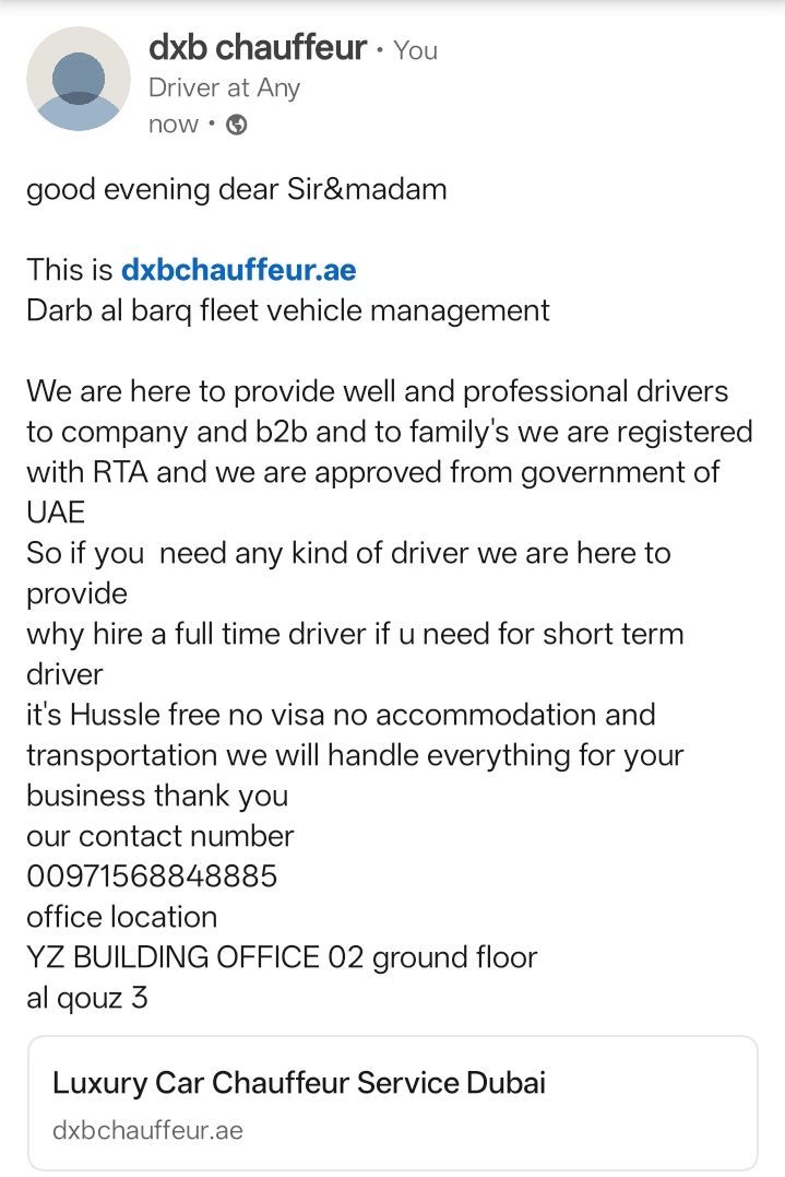 We are here to provide you a good driver and professional drivers we are approved from UAE government and from RTA so feel free to contact for farther details
