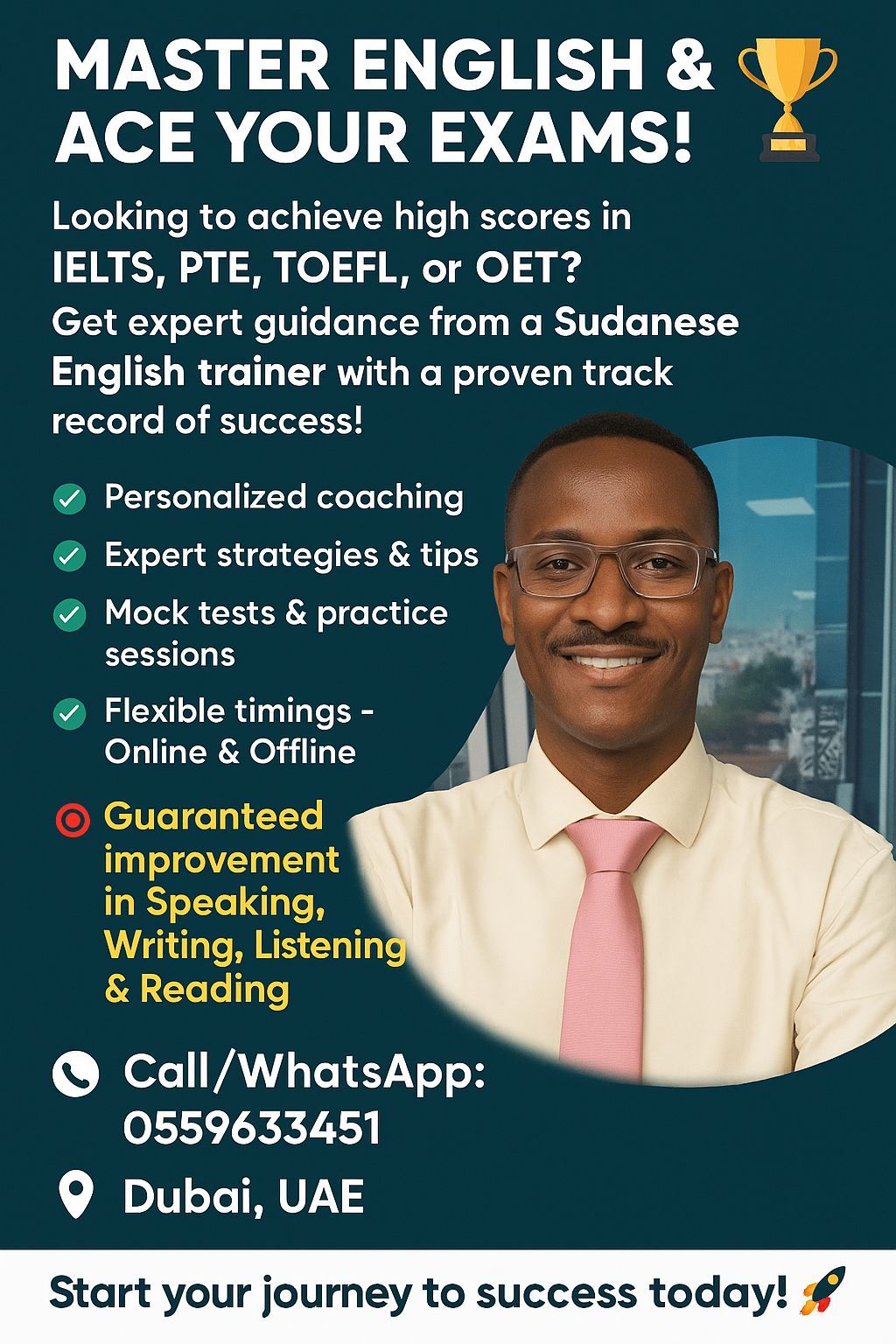 أستاذ لغة انجليزيه سوداني في الشارقة المجاز 2 اعمل في كلية كامبريدج ومركز تدريس في الشارقة أقدم كورسات في الآيلتس، التوفل، أو أي تي المهن الطبية، المخاطبة الترجمة البحث العلمي والتدقيق اللغوي أون لاين وحضوري شاهد الرفيو تبعي مع في غوغل حاصل علي أكثر من 30 رفيو لتعليم اللغة الانجليزية