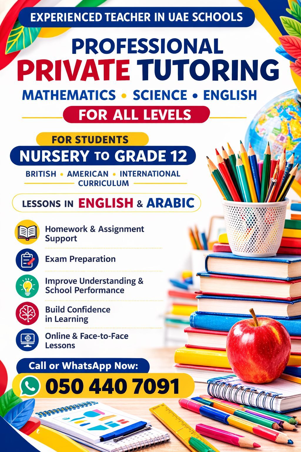 A qualified and experienced teacher offering private tutoring for students from Nursery to Grade 12. I support students with homework, exam preparation, and improving their understanding in all subjects. Lessons are available in English and Arabic, online or face - to - face