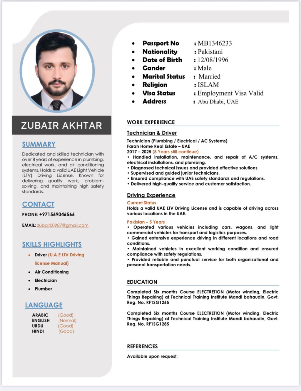 I have experienced 6 years in my work as senior technician, electrician, Air Condition, plumber + UAE driving license holder mentioned in my CV
