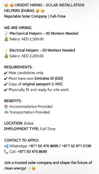 Mechanical Helpers 30 (Salary 2500) Electrical Helpers 20 (Salary 2200) are needed in a Solar Panel Installation company in Dubai, Investment Park 2 (DIP 2) Accommodation & Transportation given