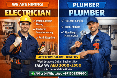 We are hiring for Electrician and Plumber for an Interior Design company in Business Bay, Dubai. Salary is between 2000 - AED2500. People on visit visa and cancelled visa apply. Immediate joiners needed. Send your CV