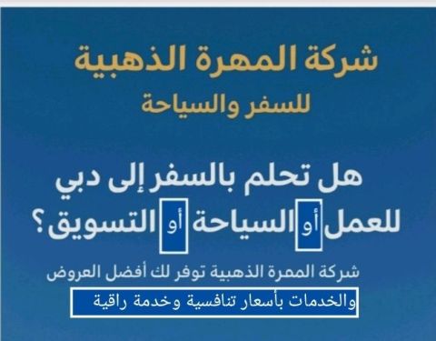 Al Mahra Al Zahabia Travel & Tourism welcomes you Do you dream of traveling to Dubai for work, tourism, or marketing Al Mahra Al Zahabia offers you the best deals and services at competitive prices and with exceptional service. Our services include visa processing for work in the UAE, and pre - and post - travel support and consultations. Why choose Al Mahra Al Zahabia 1 - Fast processing 2 - Compe